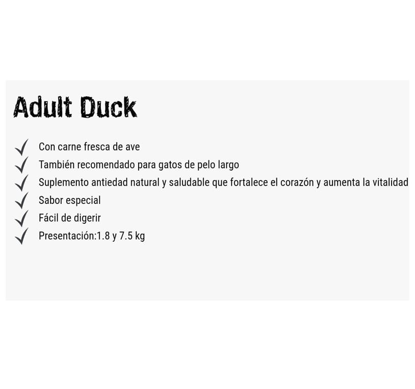 Carne de ave fresca (30 %); proteína de pato*¹ (18 %); arroz; proteína de ave con bajo contenido en ceniza (10 %); fécula de patata; grasa de ave; hígado de ave; centeno; huevo; harina de pescado de agua salada (2,5 %); zooplancton marino (krill)*⁴ (2,5 %); levadura de cerveza inactivada; semilla de uva prensada por expulsor (1,5 %); semillas de chía (1,3 %); algarroba tronzada; harina de germen de guar; cloruro sódico; cloruro potásico; inulina de achicoria secado hidrolizado malteado molido.